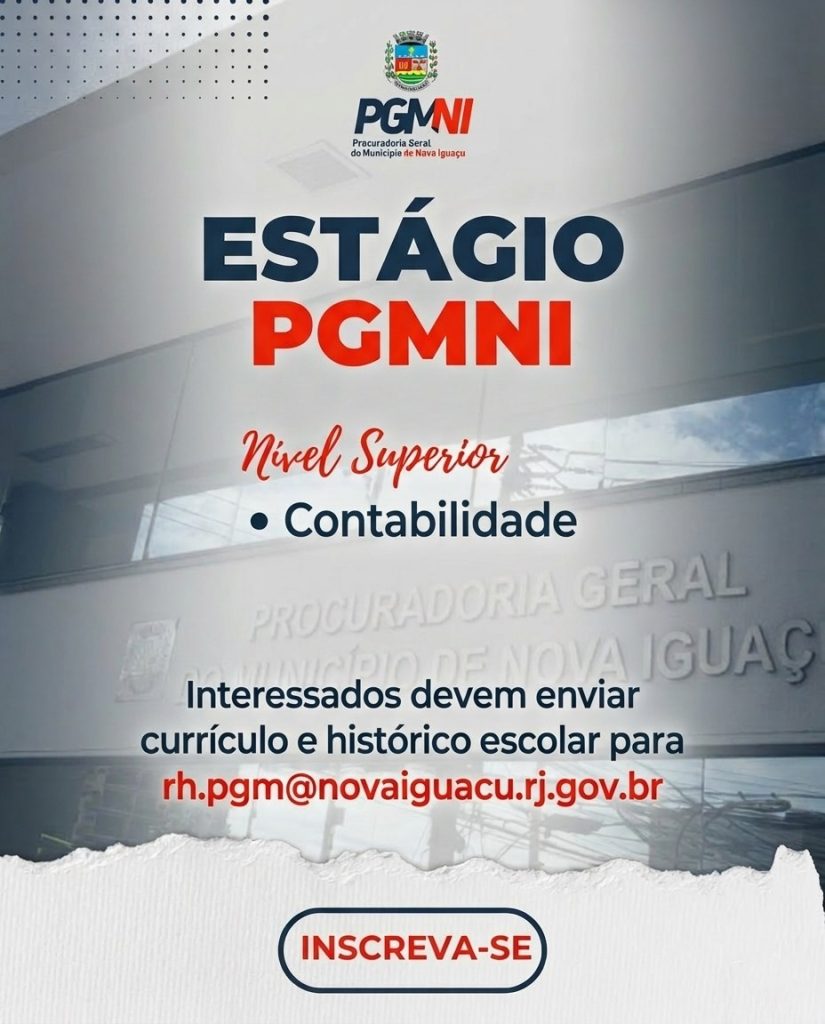 ESTÁGIO PGM-NI: VAGA PARA CONTABILIDADE Autor do post:Adriano Netto Post publicado:18 de março de 2026 Categoria do post:Sem categoria A PGM-NI está selecionando estudantes para estágio na seguinte área: Contabilidade (nível superior) Interessados devem enviar currículo e histórico escolar para rh.pgm@novaiguacu.rj.gov.br Você também pode gostar implantação do SIGA na PGM-NI 26 de maio de 2022 PGM de Nova Iguaçu convoca aprovados no Concurso Público e novos estagiários 8 de janeiro de 2020 Coronavírus: PGM de Nova Iguaçu suspende exame de seleção de estagiários 13 de março de 2020